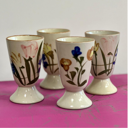 De set van vier koppen zijn gevonden in een oude boerderij in Frankrijk. Met een prachtig bloemmotief in zachte, natuurlijke tinten.