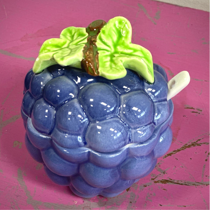 Hoe leuk is dit keramische suikerpotje in de vorm van een sappige braam? 🍇 Met zijn glanzende blauwe afwerking en speelse groene blaadje op het deksel is dit een echte eyecatcher in je keuken. Het potje heeft een handige opening voor een lepeltje en is perfect voor suiker, honing of andere lekkernijen. Een uniek kringlooppareltje voor liefhebbers van fruitige vintage serviesstukken!