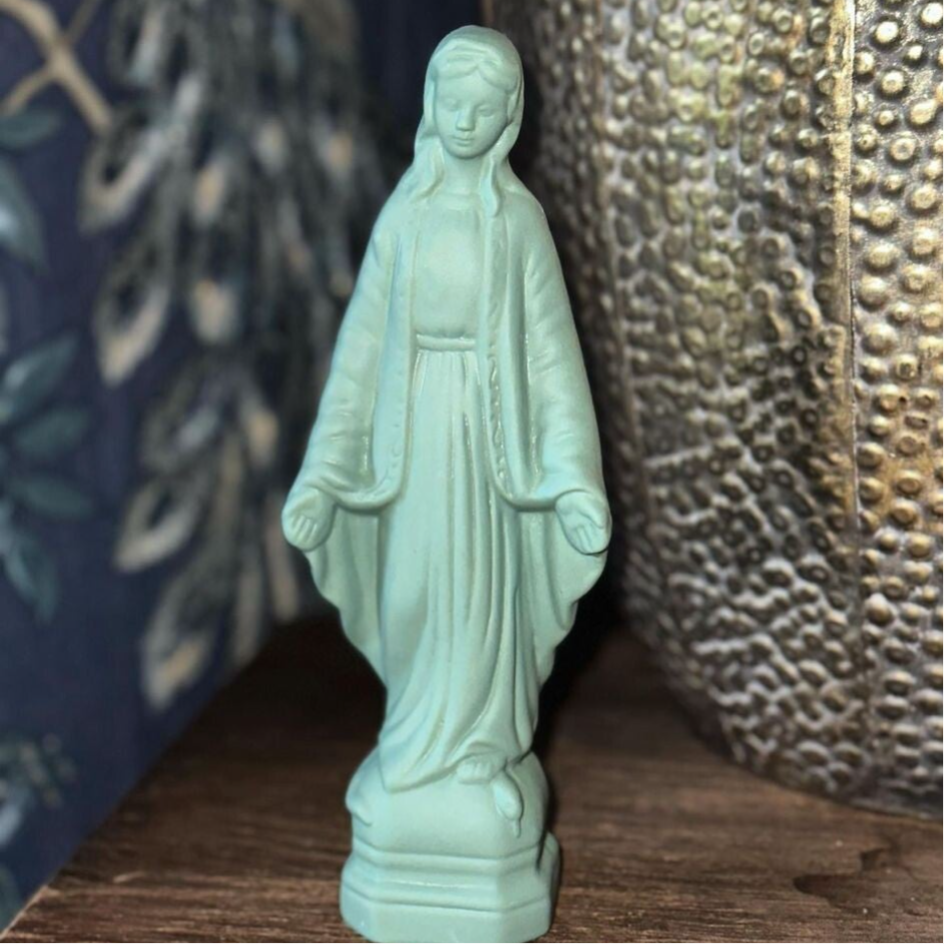 Een trendy beeldje van Madonna. In de religieuze beeldende kunst is dit een bekende pose om Maria af te beelden. De iconische vrouw met haar lange gewaden en de opgevouwen handen wordt wereldwijd herkent als de Maagd Maria. De Heilige Moeder die troost en hulp biedt, met welke religie – of juist niet – je je ook maar identificeert. Madonna is uitgegroeid tot een waar stijlicoon met een bijzondere betekenis. We hebben dit kunstige beeldje nu ook uitgebracht in de trendy jadegroene KLEI kleur die thuishoort in elk modern interieur.